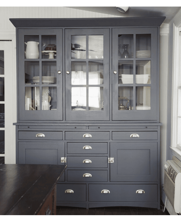 Alacena negra, una pieza moderna y funcional para tu hogar. Presenta tres puertas de vidrio en la parte superior con repisas para exhibir tus objetos favoritos, ademas de una parte inferior con dos puertas de madera y ocho cajones.