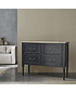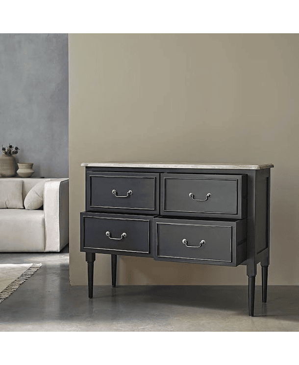 Con un aire vintage, esta cómoda combina el cuerpo negro con una cubierta de madera natural. Tiene patas altas, 4 cajones con moldura y tiradores de bronce que completan el diseño con un toque clásico.