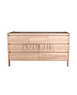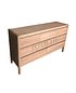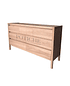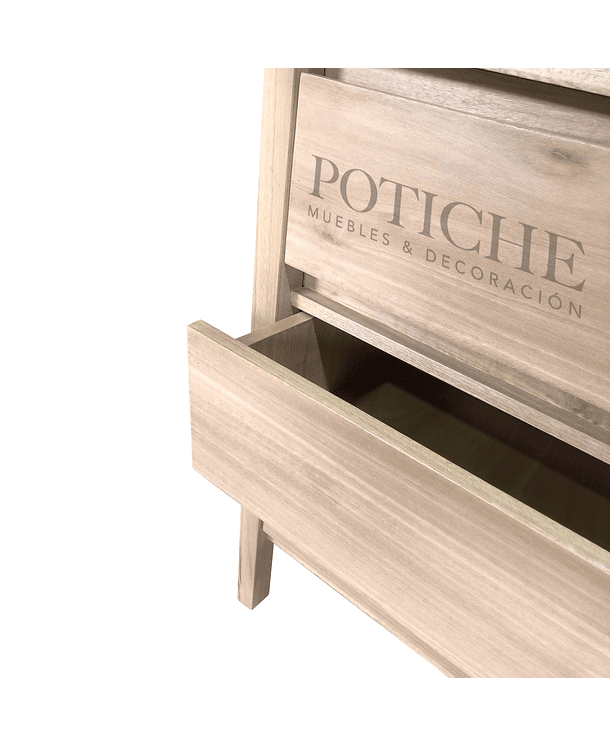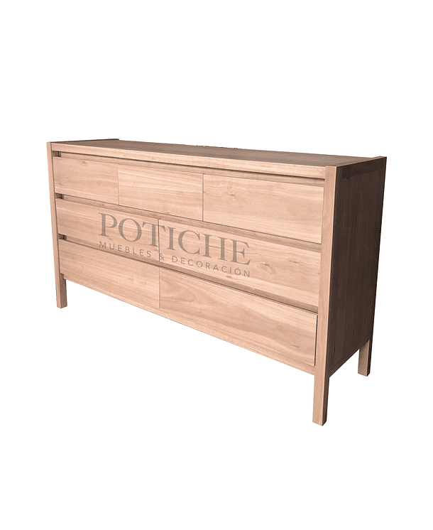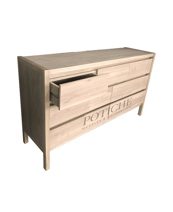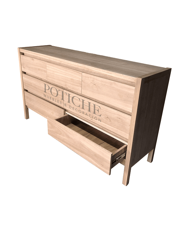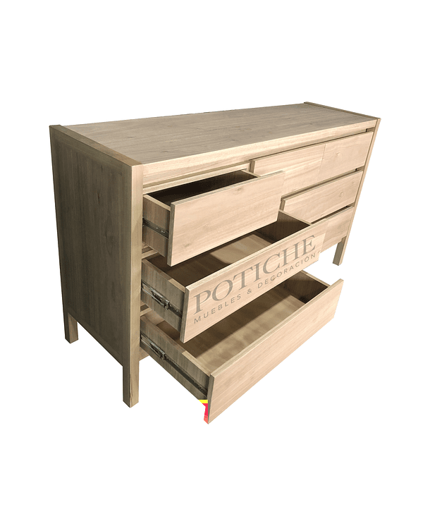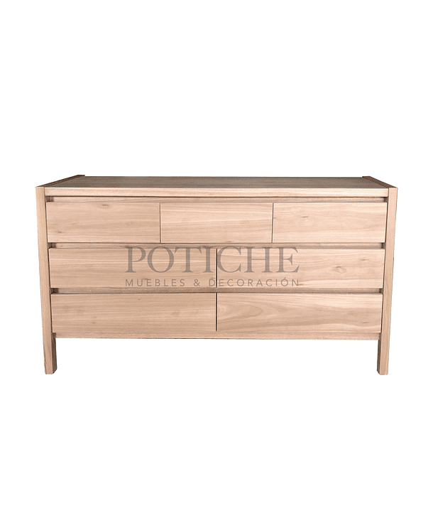 Diseño limpio y práctico, con patas altas y terminación natural. Tiene cuatro cajones largos abajo y tres más pequeños arriba. No lleva tiradores: los cajones se abren con bisel, lo que mantiene la vista despejada y simple.