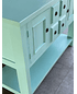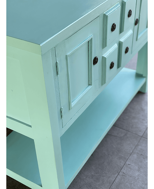 Arrimo en lenga y enchape en lenga Cuenta con 2 puertas laterales y 4 cajoncitos funcionales. Lacado color verde celeste agua (8550W refined blue)