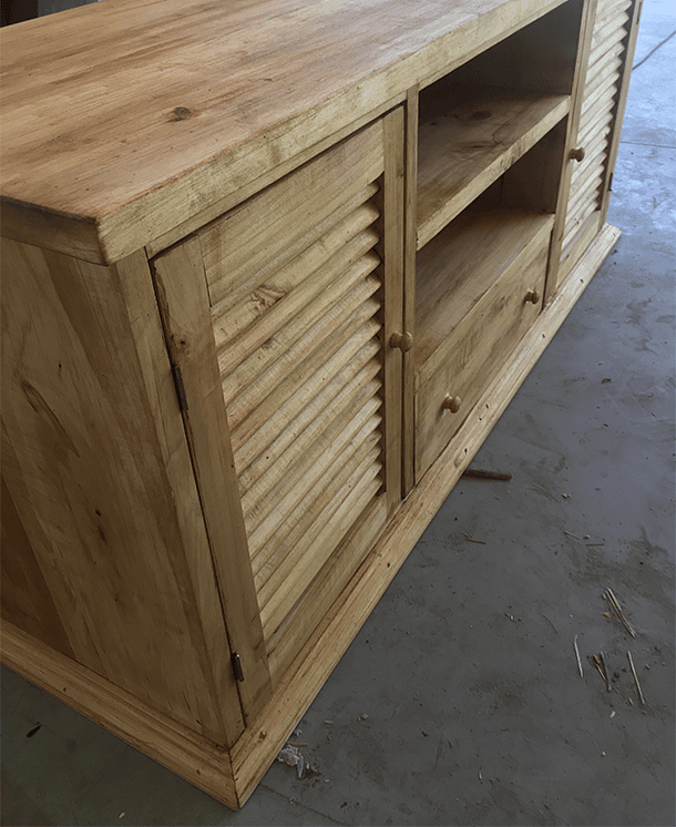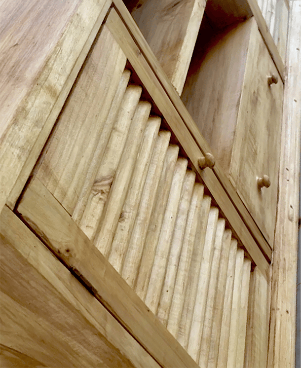 Rack de Lenga, Rauli, Roble de Demolición con 2 puertas de celosía, al medio 2 espacios libres y 1 cajón.