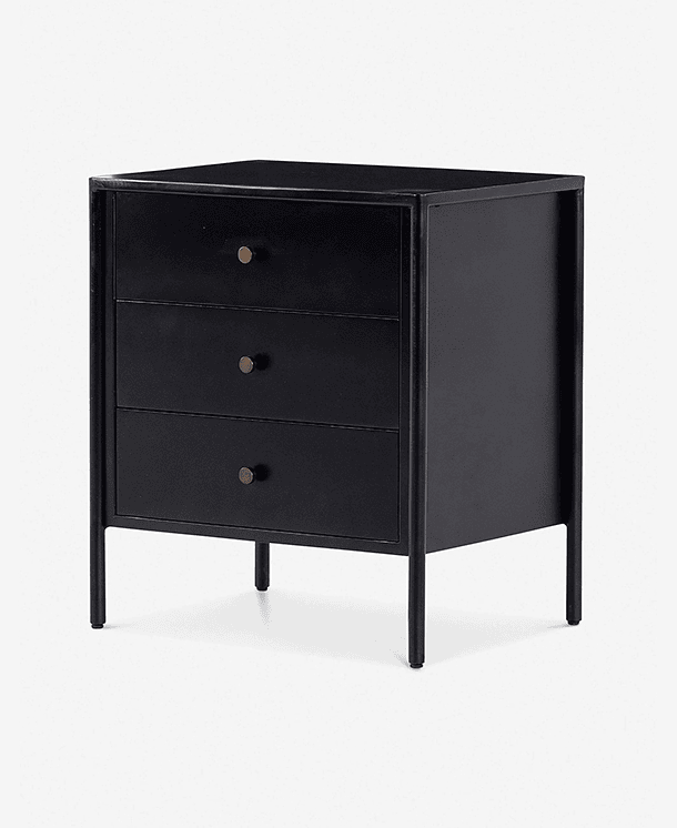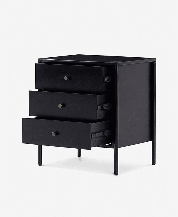 Descubre nuestro velador negro con tres cajones y patas. Con un diseño moderno y funcional, este velador ofrece un práctico espacio de almacenamiento para tu dormitorio.