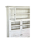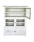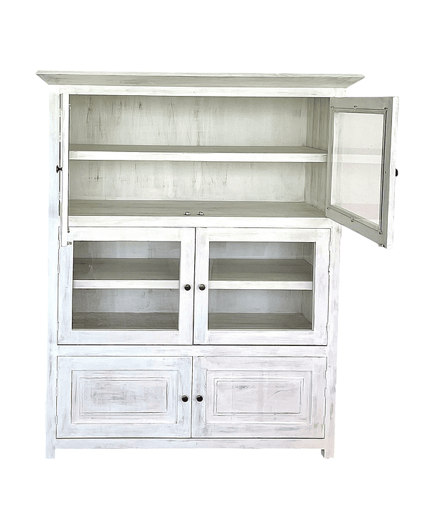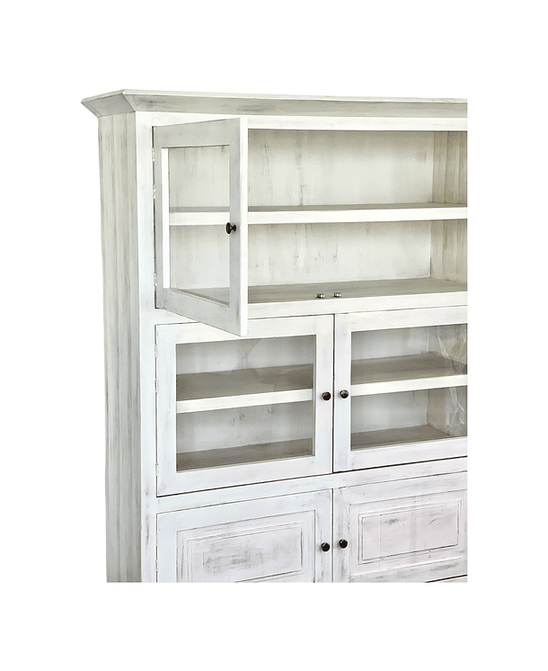 Vitrina Lenga, laterales e interiores enchape lenga. Color blanco decapado suave, 4 puertas con vidrio. Abajo 2 puertas cerradas. Tiradores color bronce oscuro.