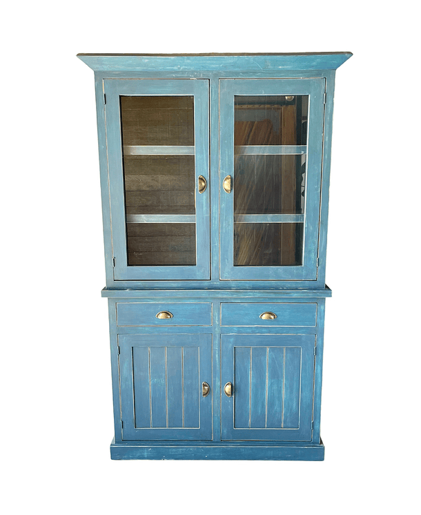 Vitrina estructura lenga y enchape en lenga con copero. Cajones con rieles telescópicos. Parte inferior una repisa. Fondo en terciado ranurado. Tirador conchita bronce.