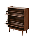 Encanto y organización , nuestro zapatero con patas altas en tono nogal claro cuenta con dos compartimientos y bisagras plegables, agregando estilo y funcionalidad a tu espacio.